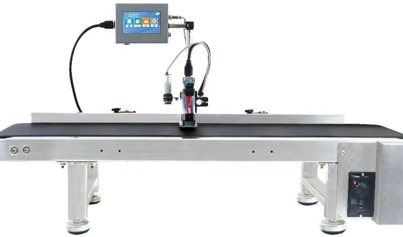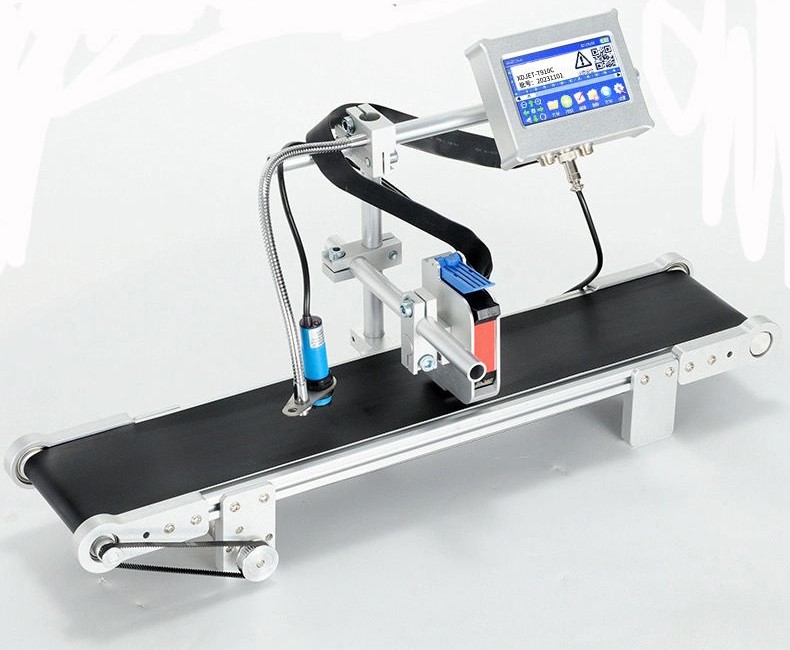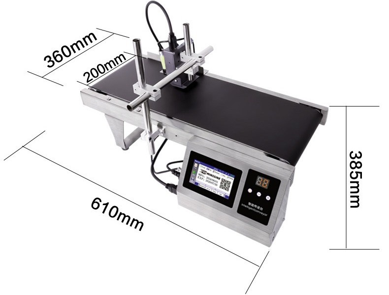 AIMS brand Compact Continuous flat belt Compact variable speed conveyor Model FBC – 200S (200 x 610mm) with PVC conveyor belt of size 200 mm width X 610 mm long & 30 mm height Stainless Steel machine, having a Variable speed 1 to 15 meters / min. ABLE tech Intelligent small desktop conveyor-inkjet printing machine. This machine is suitable for the small paper box, bottles and pouches. It can automatically convey and inkjet print at the same time, which is suitable for the small packages pharmaceutical factories, cosmetics, medical consumables and other industries. It is suitably designed to provide proper conveyance to objects for proper Ink Jet Printing (Model T360-O / MX1-A).