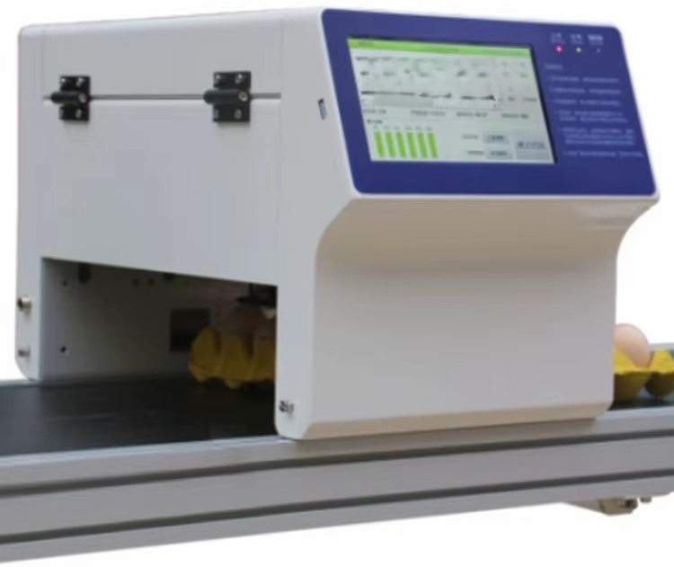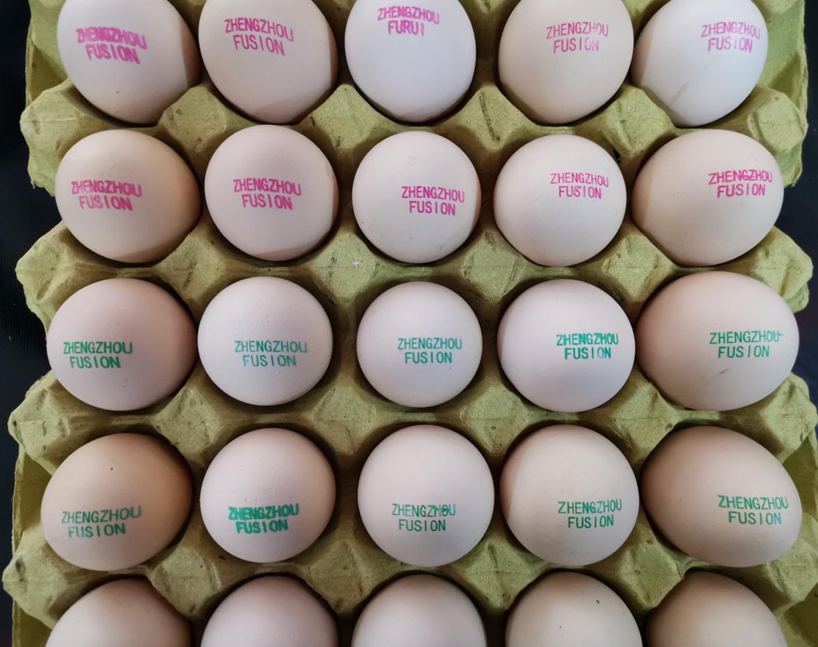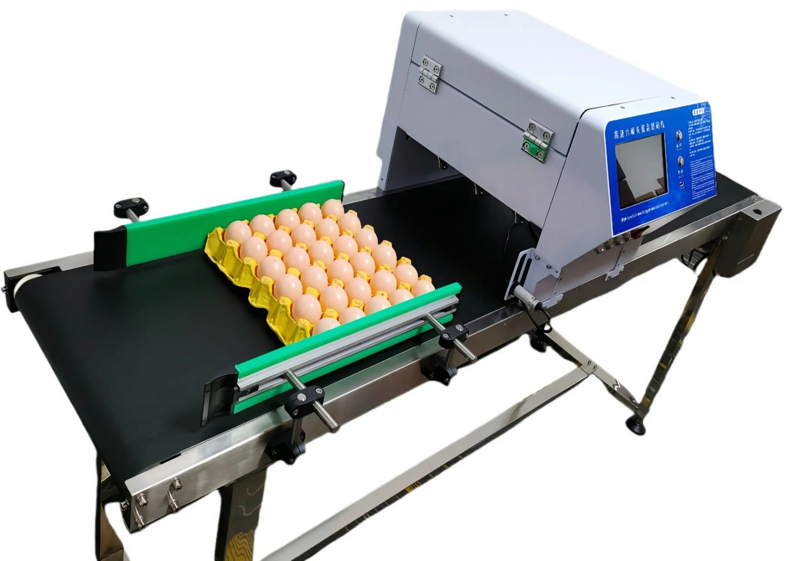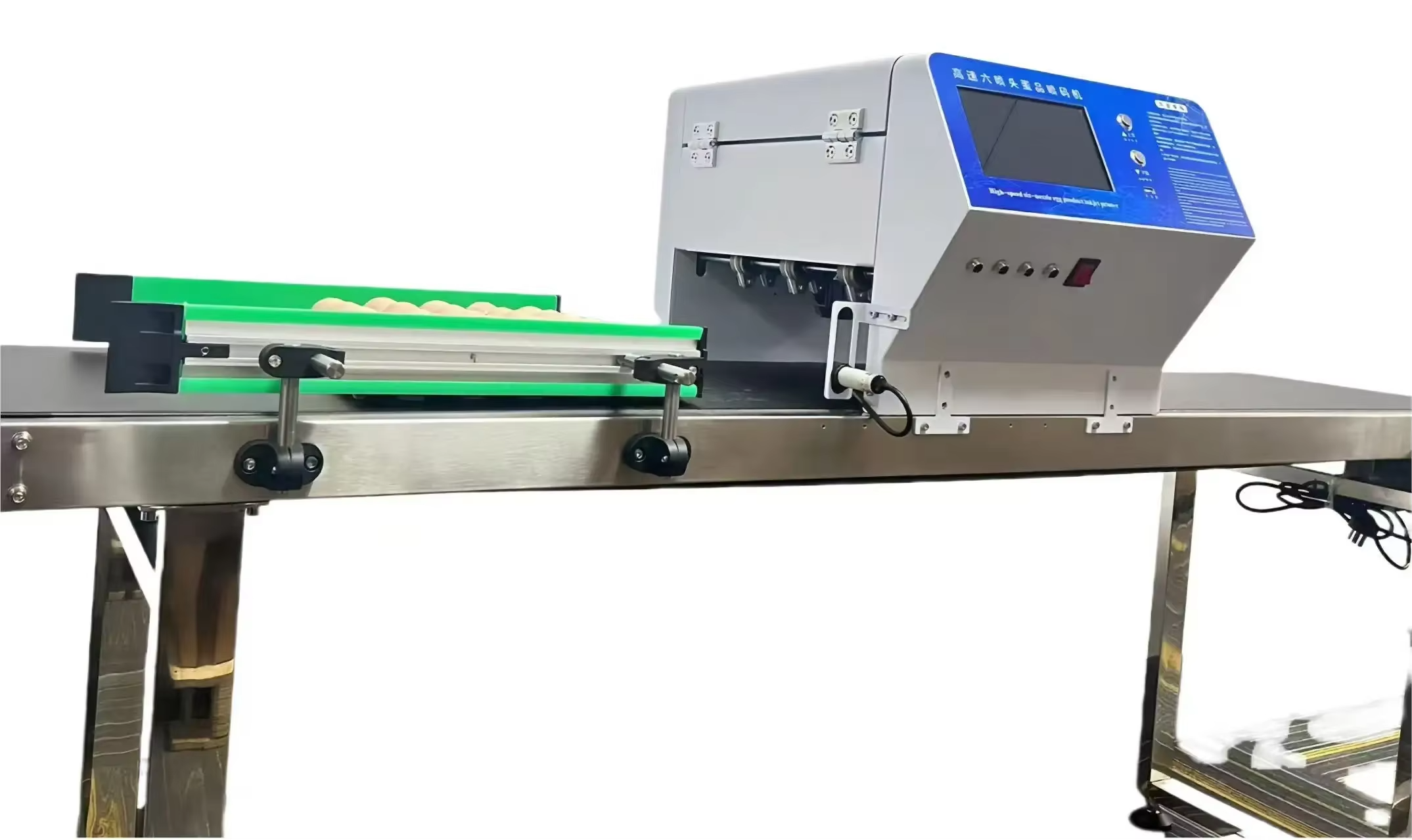 Colored Touch Screen Six-Head Egg Jet Printer Model IJP – EGG–EP6 (12.7mm), which is an economical, Zero Maintenance, user friendly, high resolution, FOUR line, Non-Contact printer specially designed to print on 6 rows of eggs on tray simultaneously (in 6 different colors if required) without the use of Print-Head traversing system. The system comes complete with conveyor system to feed egg trays & can easily be integrated with existing production lines & can print Company Name, Serial No., LOGO, Pro. Dt., Exp. Dt., B. No., QR Code, etc. It is a High Speedsingle pass printer & has a 7” Colored Touch Screen Display for setting all parameters. The printer can store unlimited messages. It has a capacity of printing 15,000 ~30,000 eggs / hour of soil eggs, firewood eggs, foreign eggs, duck eggs, pine eggs, preserved eggs, colorful eggs, etc.