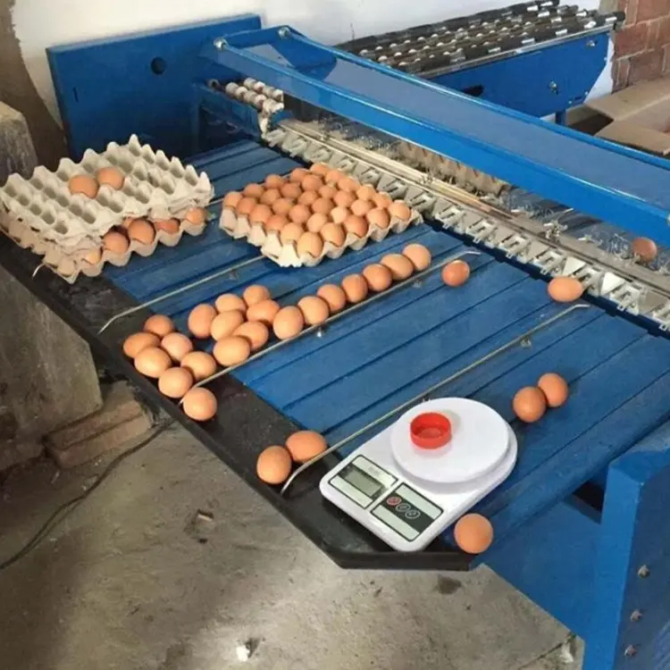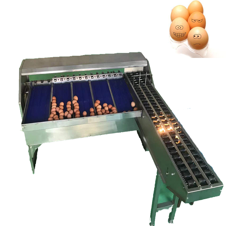 After the candling, the good eggs will be conveyed into the grading part and they will be divided into 5 grades by weight, eggs of different weight will fall down onto different channels and eggs of the same weight will fall down onto the same channel.