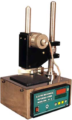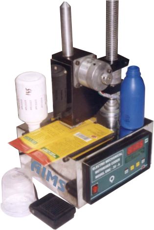 Table Top Electro-Mechanical (motorized) Coder Model EMC – 35 – T with Digital display, soft touch keys& production counter, for semi-automatic registered printing of B.No., Mfg.Dt., Exp.Dt., M.R.P. `, etc. The stereos used are flat or grooved type which can be easily press fitted & replaced daily for a max. 4 to 6 line printing area of 35 X 35 mm. It has in-built settable timer for speed control & also has Foot Switch for controlled operation to give production speeds from 1000 to 3000 pieces per hour depending upon operator skill. (Free accessories include ½ Lit. Ink, ½ Lit. Solvent, 2.5 mm Grooved Rubber Character Set, Ink Cartridge & Foot Switch). This coder is multi-purpose & suitable for registered printing on pouches, labels, laminated cartons, tins, bottles (curvature), etc.