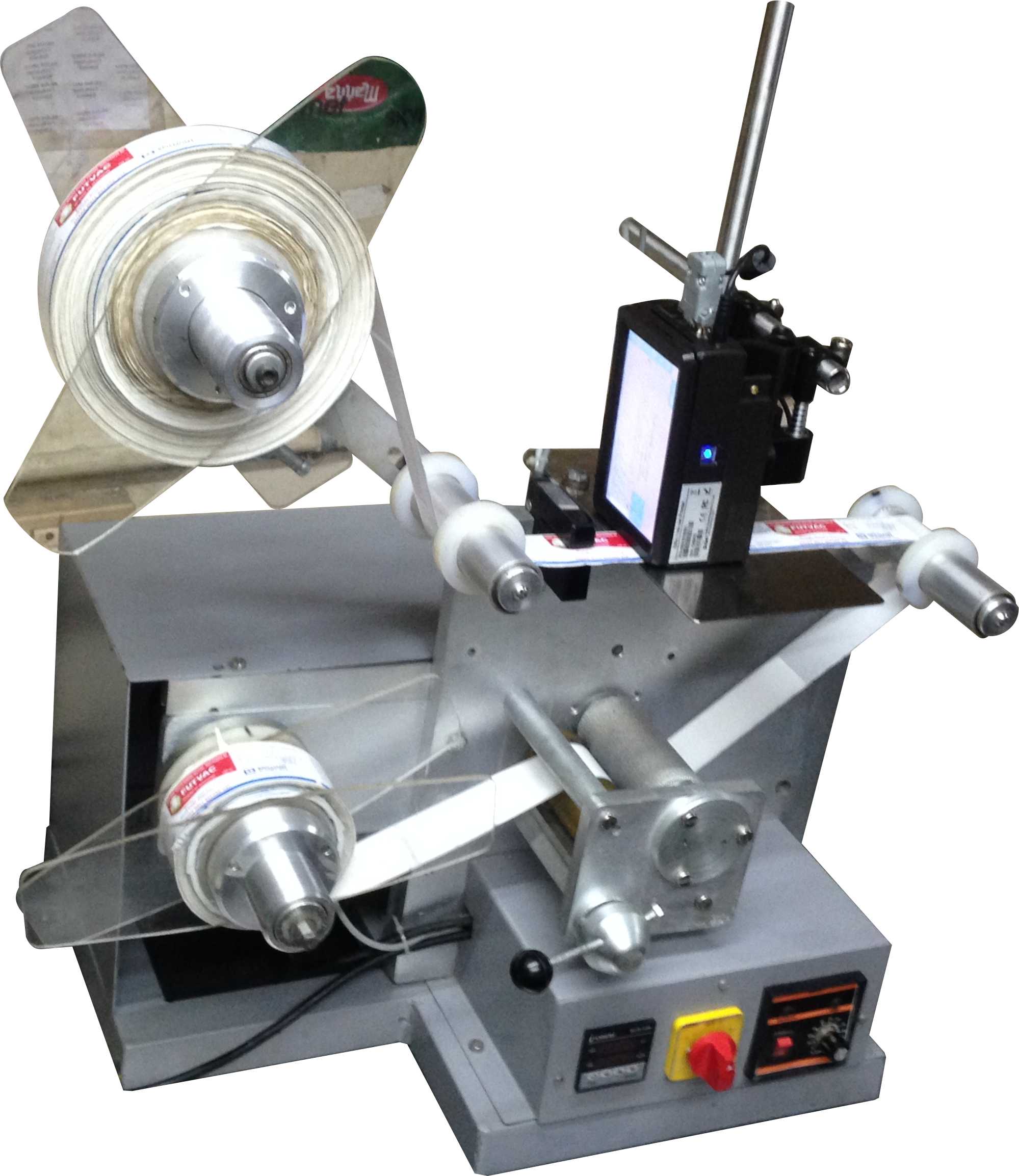 High Speed Label Roll Winder with Counter (with optional Printer*) Model LPM – 100 is a dedicated machine for winding Label Rolls with Counting at high speed or for dispensing Labels one by one for manual labeling. Optionally it can be fitted with the Model IJP-Elfin-IC Ink Jet Printer for registered printing of BNo, MfgDt, ExpDt, MRP, etc. on Label rolls at exact location, with winding & rewinding at high speeds up to 1500 labels per minute.