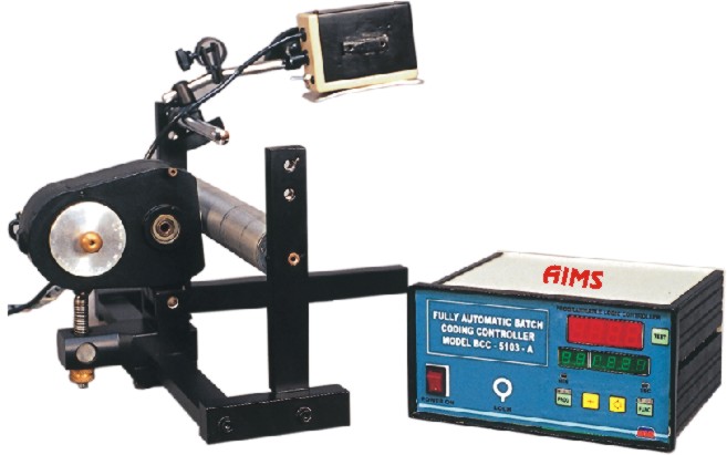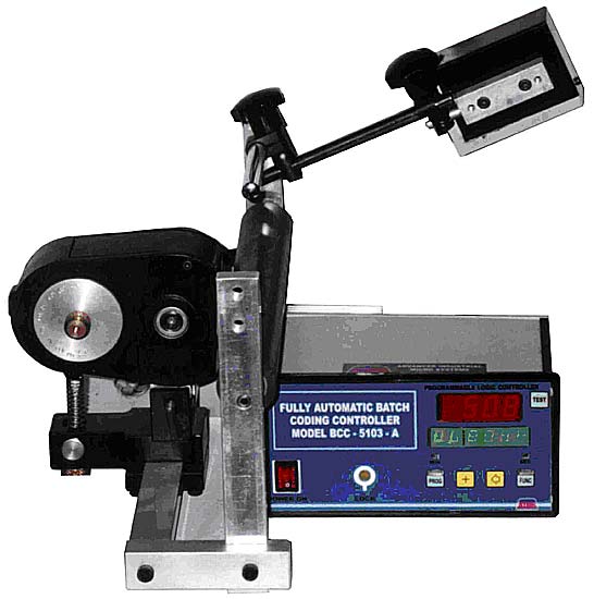 Fully Automatic PLC based On-line Ink Coder Model BCC – 35 – O with Digital display, soft touch keys& production counter, for registered printing of B.No., Mfg.Dt., Exp.Dt., M.R.P. `, etc. with facility for automatic speed tracking of the main machine. It uses easily changeable flat type rubber / nylon stereos for 4 to 6 line printing of size 35 X 50 mm & speed upto 600 packets per min. (Free accessories include ½ Lit. Ink, ½ Lit. Solvent, 3 mm Flat Rubber Character Set, Ink Cartridge & Print Sensor).This coder is best suited for continuous type variable speed FFS (Form Fill Seal) machines, pouch packing / flow wrapping / blister pack machines, biscuit / masala / oil / milk / water packing, conveyor systems, winder-rewinder system, etc.