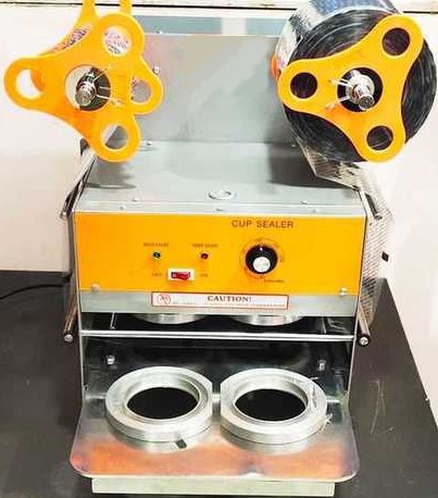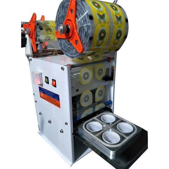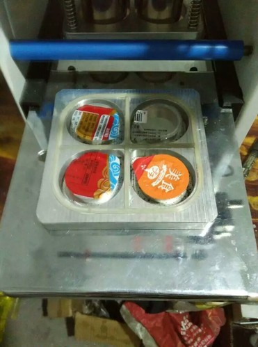 Semi Automatic Quad Cup Sealer Model CPM-2001Q (80/95 mm) for sealing glasses / cups made of EPS, PS, PP, etc. of beverages, soup, water, etc. The container is pushed inside the machine where the lid is cut & sealed over it from the roll & the sealed container is then pulled out with automatic advancement of sealing film. This is Ideal for Mineral Water, Shrikhand, Carry-Out Bowl products, Soups, Jelly, Pudding, etc.